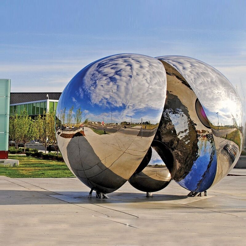 This stainless steel large ball sculpture looks like a family, the father and mother is protecting their kid from rain and sun with their body. And the kid will become a man someday, they need to experience by themselves. We should spend more time with our parents..